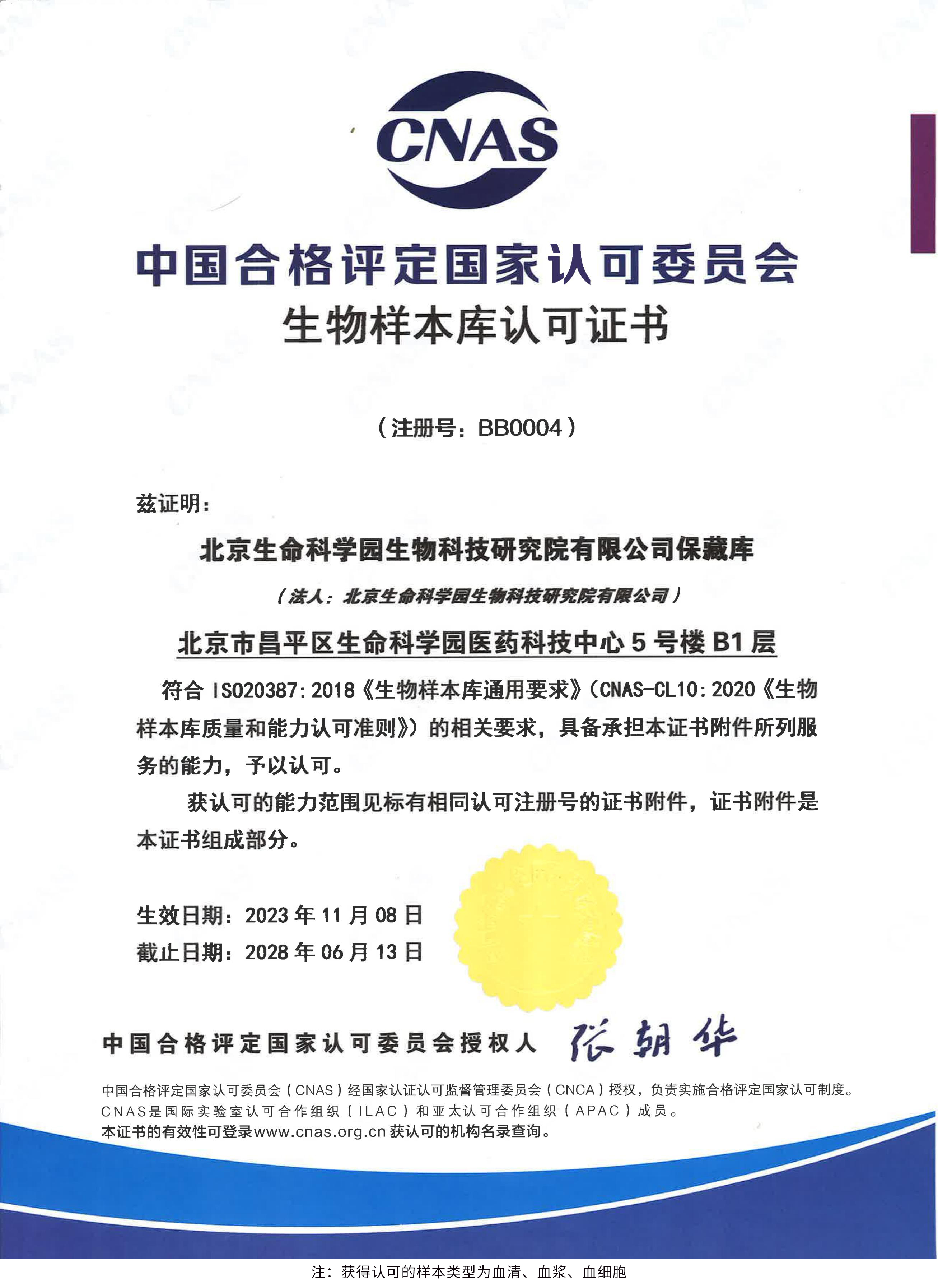北京生命科學園生物科技研究院(以下簡稱“北京生物樣本資源庫”)(Biobank of Life Science Park,簡寫“BoLSP”)是一家由北京市科委和中關(guān)村生命科學園共同支持設(shè)立的第三方生物樣本庫公共服務平臺,秉承北京重大疾病臨床數(shù)據(jù)和樣本資源庫(以下簡稱“北京庫”)(Beijing Biobank of Clinical Resources,BBCR)十余年的發(fā)展成果,聚合眾多臨床樣本專家的專業(yè)共識,致力于在生命科學、生物醫(yī)藥研究領(lǐng)域發(fā)揮銜接樣本資源持有者與研究者的橋梁作用,解決生物樣本資源開發(fā)上下游信息不對稱、資源共享困難等問題。研究院在北京中關(guān)村生命科學園昌平園區(qū)建立了2000㎡生物樣本庫,最大存儲規(guī)模達1000萬份。研究院遵循CNAS-CL10:2020《生物樣本庫質(zhì)量和能力認可準則》,同時結(jié)合北京庫過去十年的工作經(jīng)驗與教訓,建立了一套完善的生物樣本保藏質(zhì)量管理體系,從人、機、料、法、環(huán)、控多個角度,實現(xiàn)生物樣本保藏過程的全面質(zhì)量控制,先后獲得國家科技部頒發(fā)的人類遺傳資源保藏行政許可證書和中國合格評定國家認可委員會(China National Accreditation Service for Conformity Assessment,CNAS)頒發(fā)的“CNAS認可證書”。